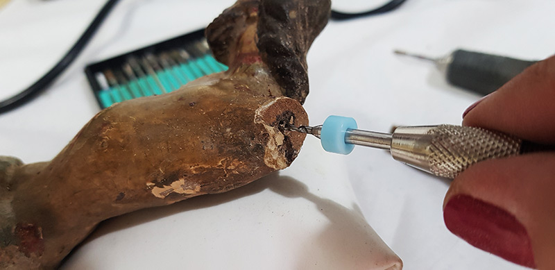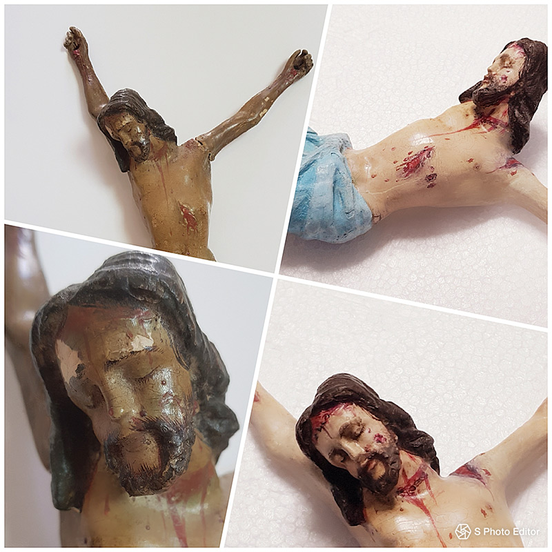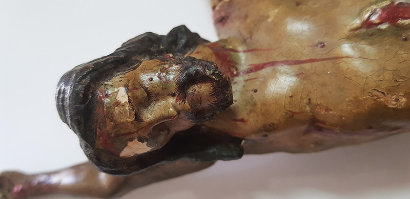 Braços e pernas totalmente soltos. Obra delicada que exigiu tempo e cuidados extras. Limpeza química e retoques da carnação e das chagas.