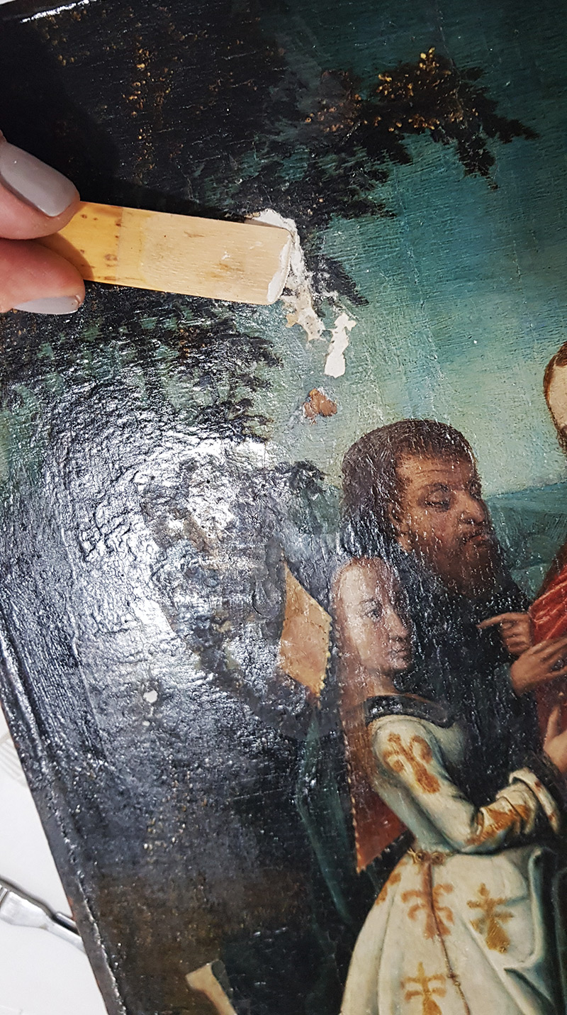 Foi estabilizada, nivelada e retocada. Por fim uma aplicação de verniz de proteção.
