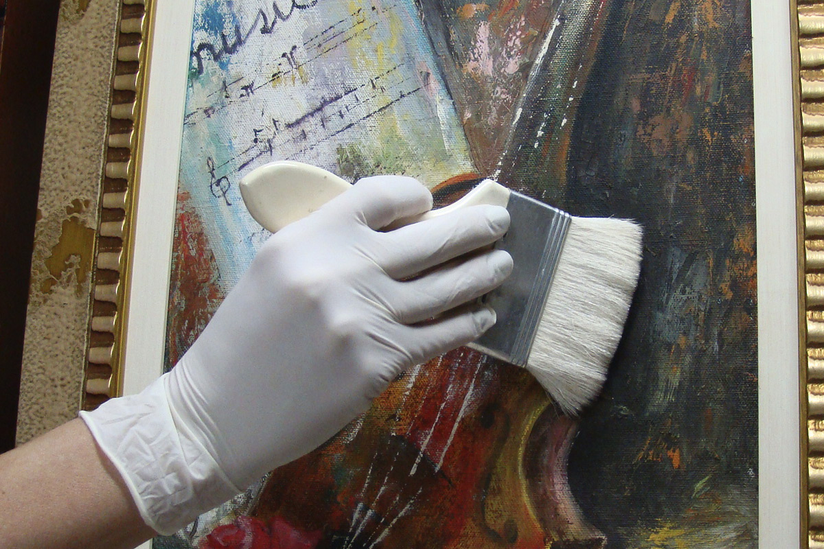 É a intervenção material humana feita por profissional especializado, visando o resgate do bem cultural. São consideradas pinturas de cavalete os quadros que são pintados em tinta a óleo sobre tela, tinta acrílica sobre tela, etc. Os problemas mais comuns são acidentes, como queda, abrasão, sujidade (sujeira comum), rasgos, verniz oxidado, entre outros. Já a arte sacra contempla as esculturas em madeira policromada (pintada), em gesso ou em resina. Fraturas e ataque de cupins (xilófagos) no caso de madeira, são os problemas mais comuns. A porcelana é sempre por problemas de fraturas e partes faltantes.