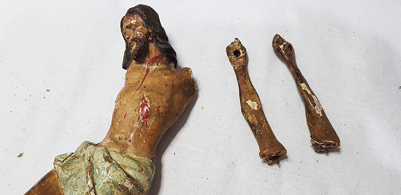 Braços e pernas totalmente soltos. Obra delicada que exigiu tempo e cuidados extras. Limpeza química e retoques da carnação e das chagas.