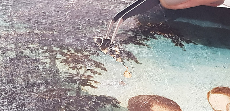 Foi estabilizada, nivelada e retocada. Por fim uma aplicação de verniz de proteção.