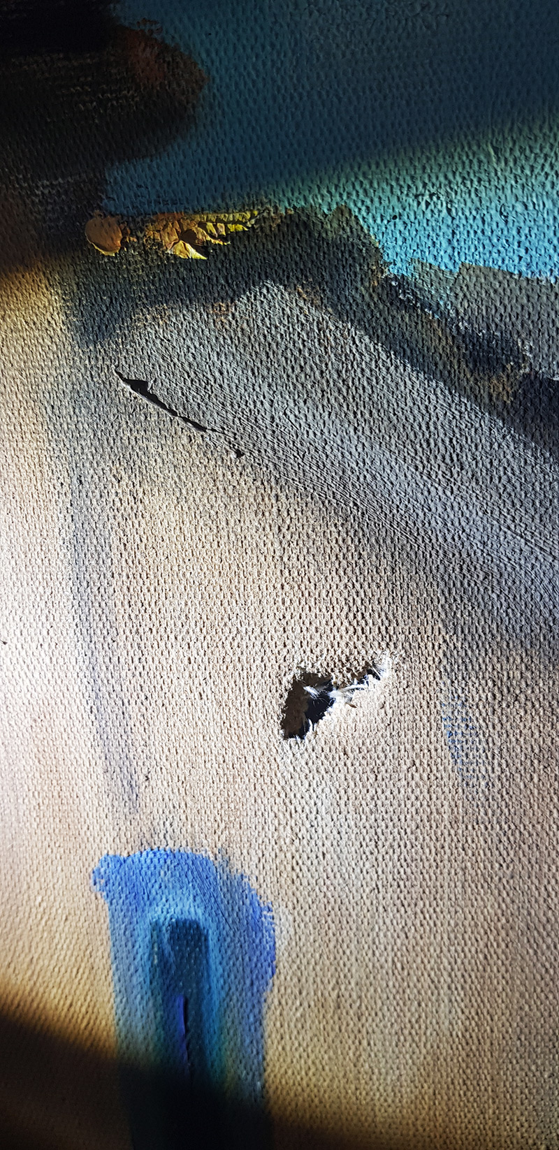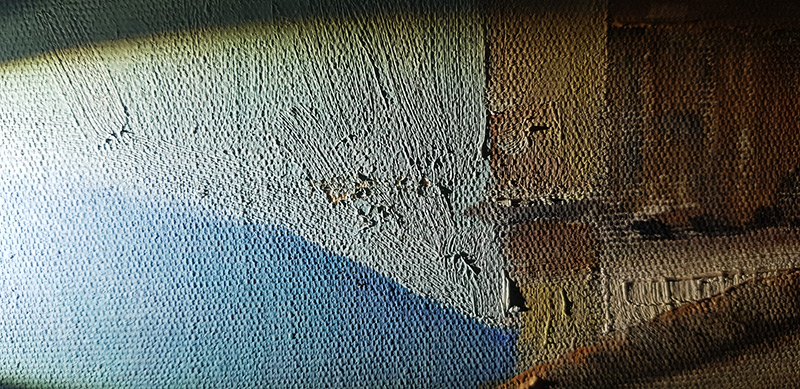 Sutura e enxertos fizeram-se necessários para a recuperação do suporte. O nivelamento e retoque devolveram a beleza para a obra.